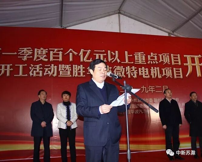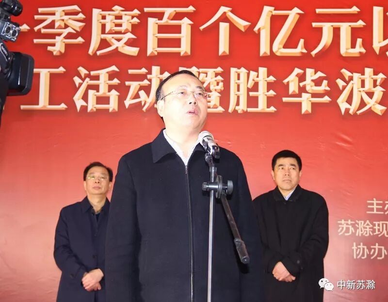 在主会场,市委书记张祥安宣布全市百个亿元以上重点项目集中开工。市长许继伟讲话。市领导王图强、汪建中、朱诚、金力、姚志,苏滁现代产业园管委会主任徐保月,中新苏滁(滁州)开发有限公司总裁何建埠,胜华波集团董事长王上胜出席开工仪式。